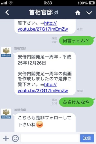 上司がLINEの首相官邸アカウントと闘ってるんだが・・・・・・・