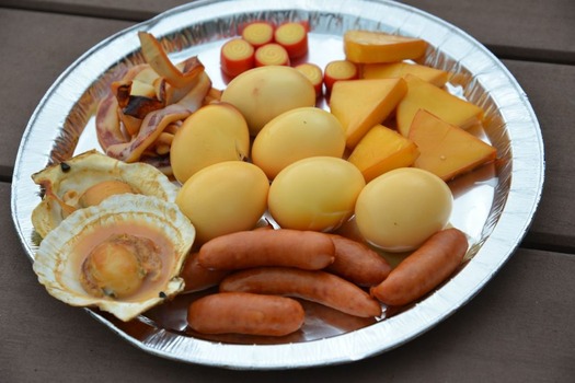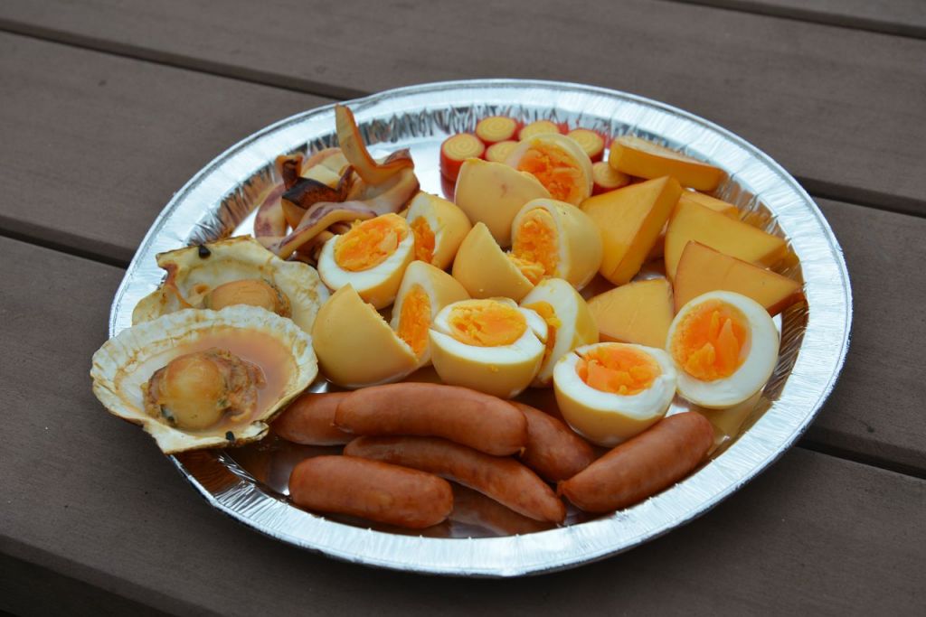ゆで卵、6Pチーズ、チーカマ、ウインナー、イカ、ホタテのラインナップ