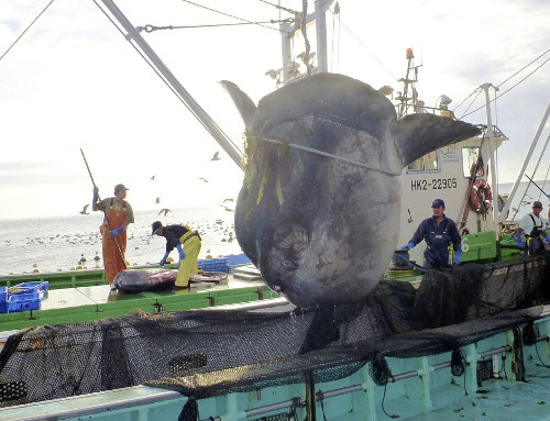 写真 函館沖の定置網にかかった巨大なマンボウ(北大大学院・松井萌さん撮影)