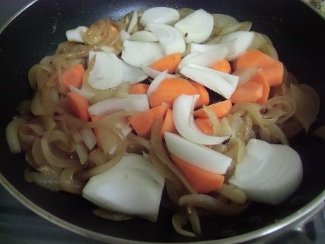 タマネギをじゅうぶん炒めたら残りのタマネギとニンジンをぶち込み