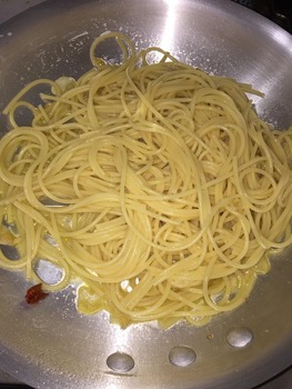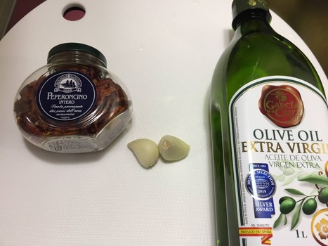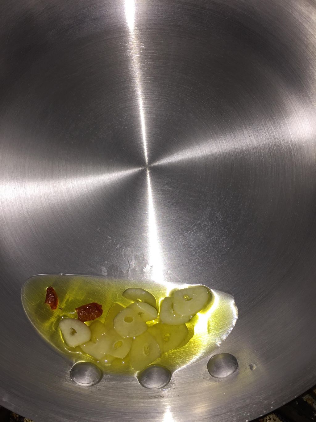 自分で作るときは最初ニンニクオイル作るときはピュアオリーブオイルで最後の仕上げ火を止めてエクストラヴァージンオイルをかけるね
