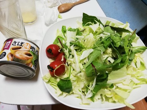 マジでエサw白飯すらなく鯖缶の汁をドレッシングにして野菜食えってか