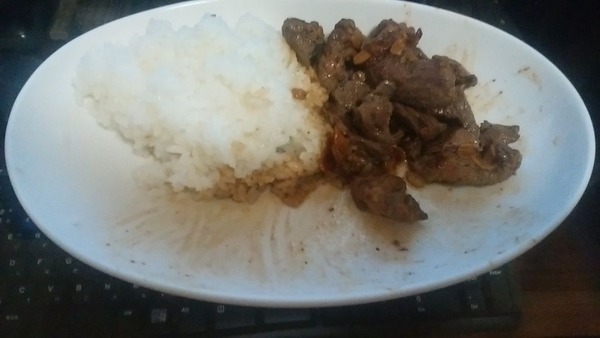 アンガス牛をスライスニンニクと一緒に焼いて塩コショウして醤油で香り付けしたやつ