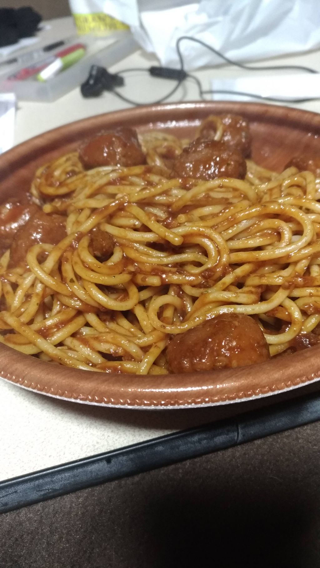 セブンのミートソースパスタにセブンのミートボール入れるだけ