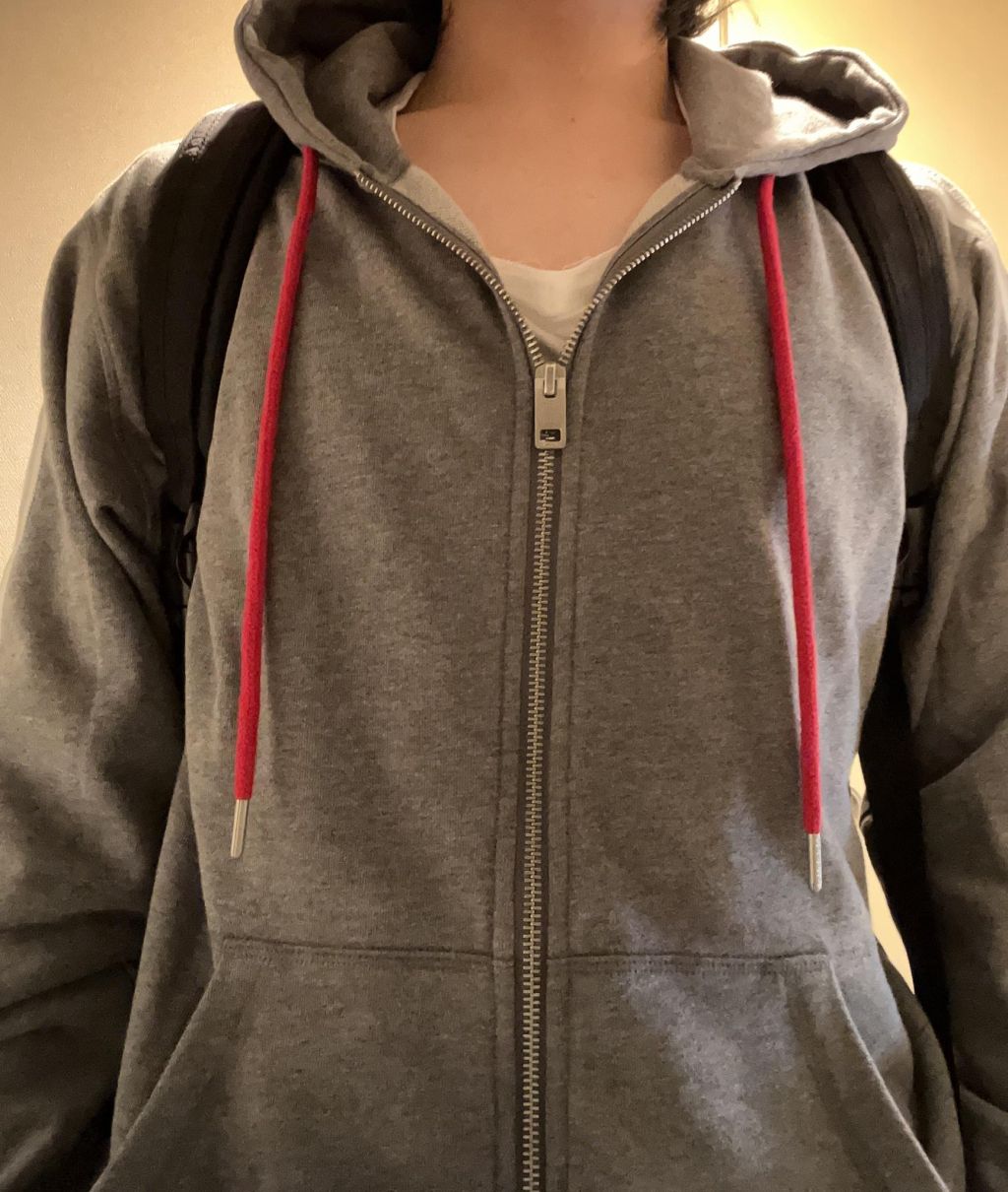 ぱっと見目に入ったのが灰色で地味、なのに勘違いした赤紐、ヨレヨレのシャツ