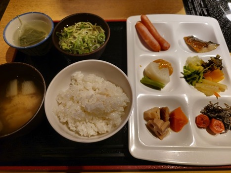 ビジホ朝食とかそんなに美味しくないんだけど、おかずがずらっと並んでいるの見るとテンション上がってついつい食べ過ぎちゃうんだよな。
