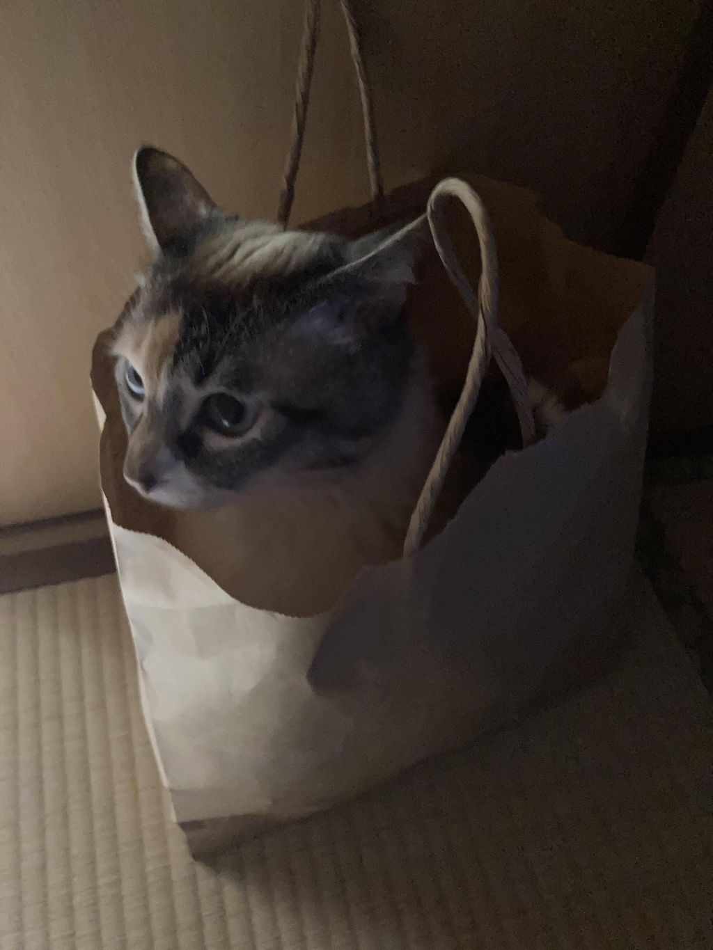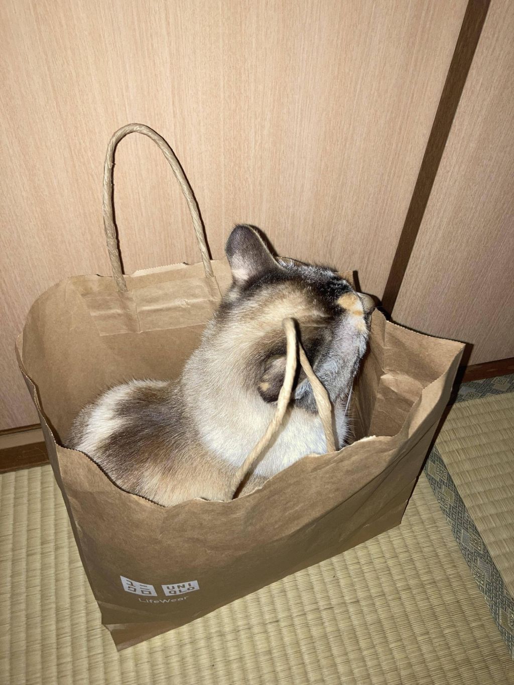 ユニクロの紙袋に入れられてじっとしてる猫ってあんまおらんよな