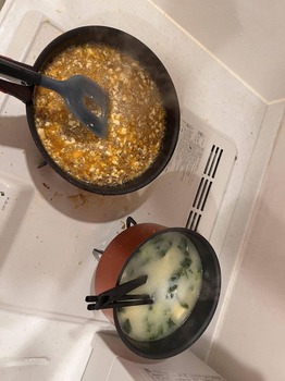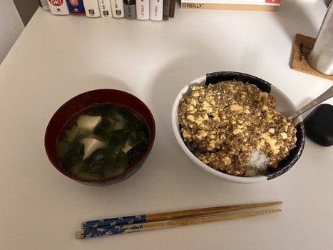 オーウ、地獄の細切れ麻婆豆腐にダイナミック味噌スープ、