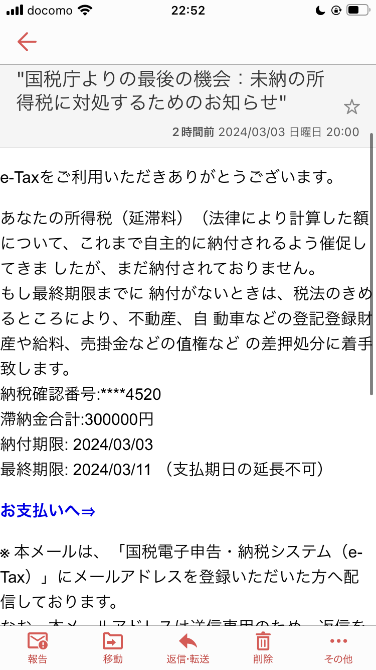 税務署職員やがこのメールが届いて署に電話かけてくるやつおるで
