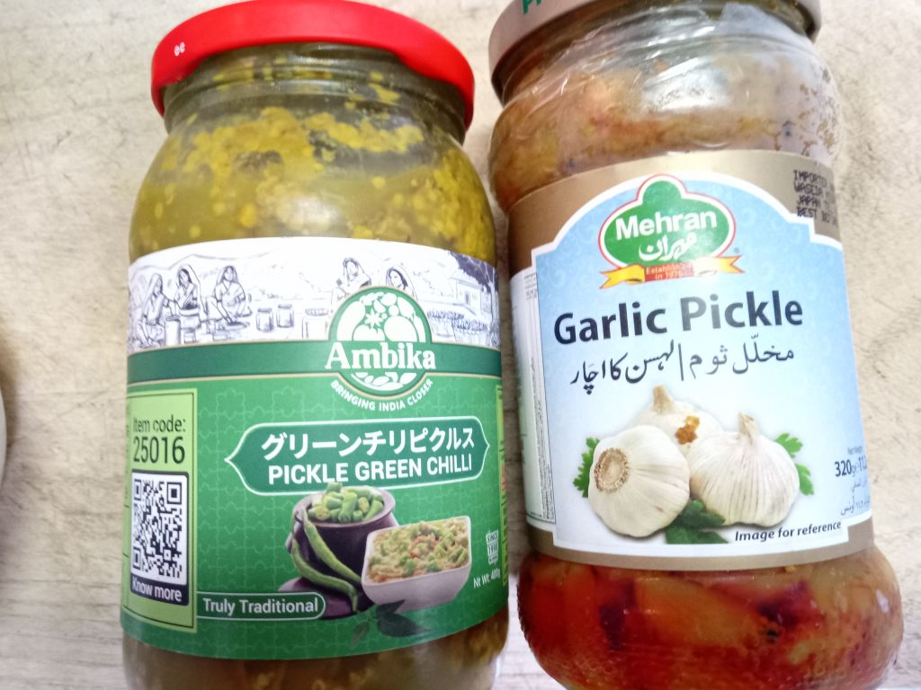 付け合わせはハラルショップで買った青唐辛子とニンニクのアチャール?漬物みたいなやつ
