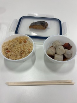 炊き込みご飯とタコの煮物はご飯茶碗に入れてタッパーに入れて持ってきた