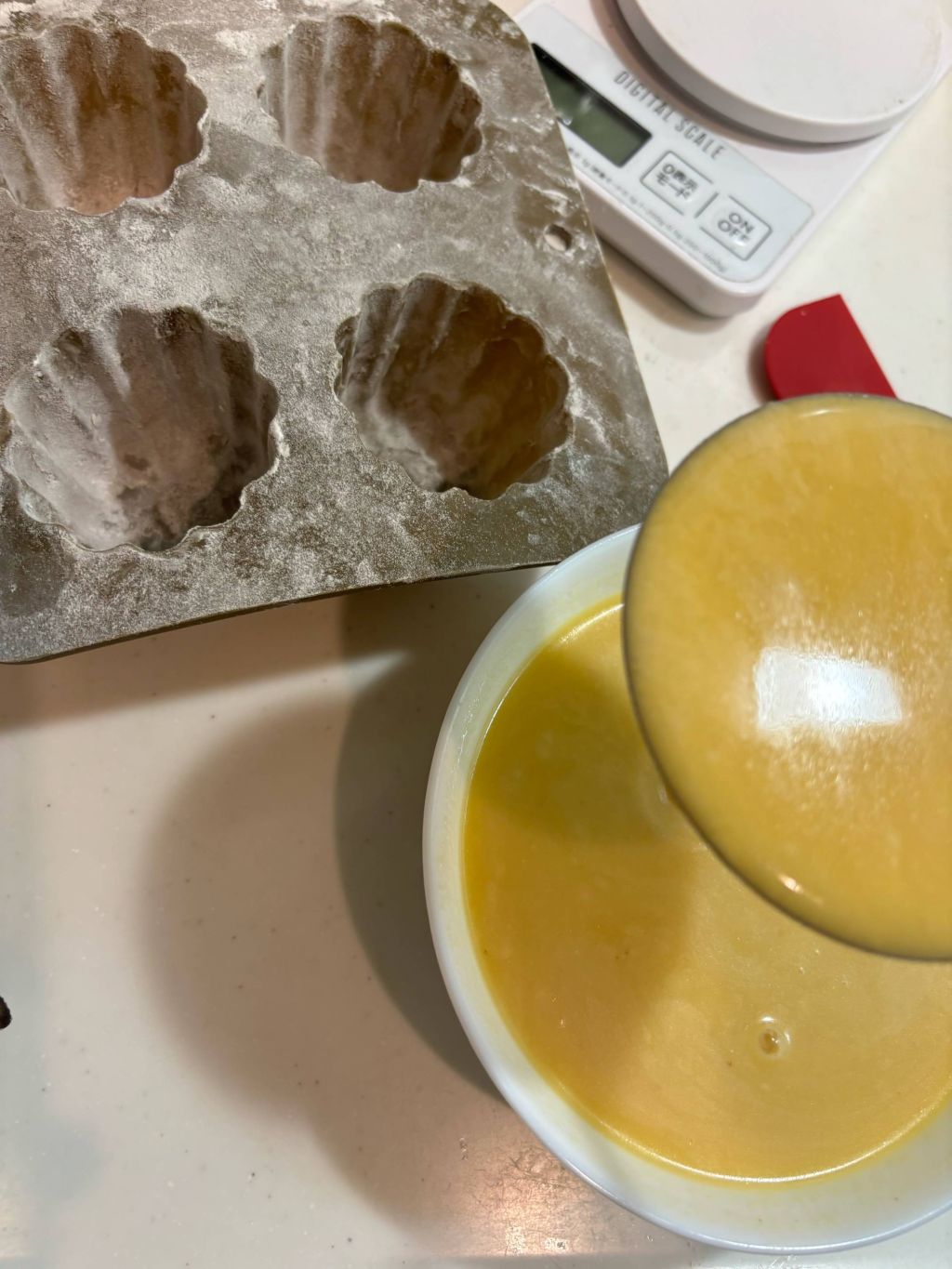 カヌレは金型でミツロウ塗らんと外側のカリカリは出せんからシリコン型では無理やで