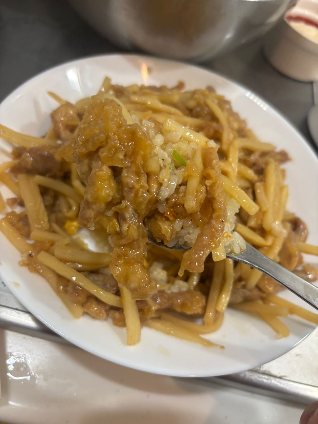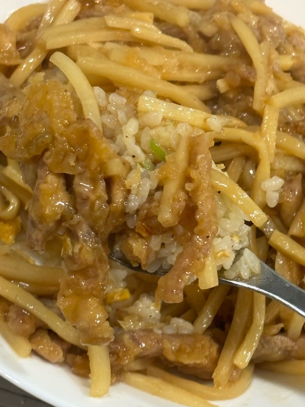 シンプルな卵チャーハンに、青椒肉絲のピーマン抜いたやつをかける。