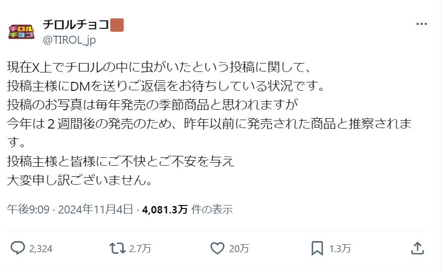 【悲報】「チロルチョコにムシ入ってる」というポストをしたアホ、詰められる…(TдT)