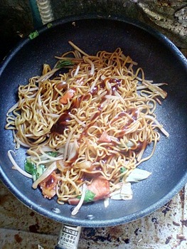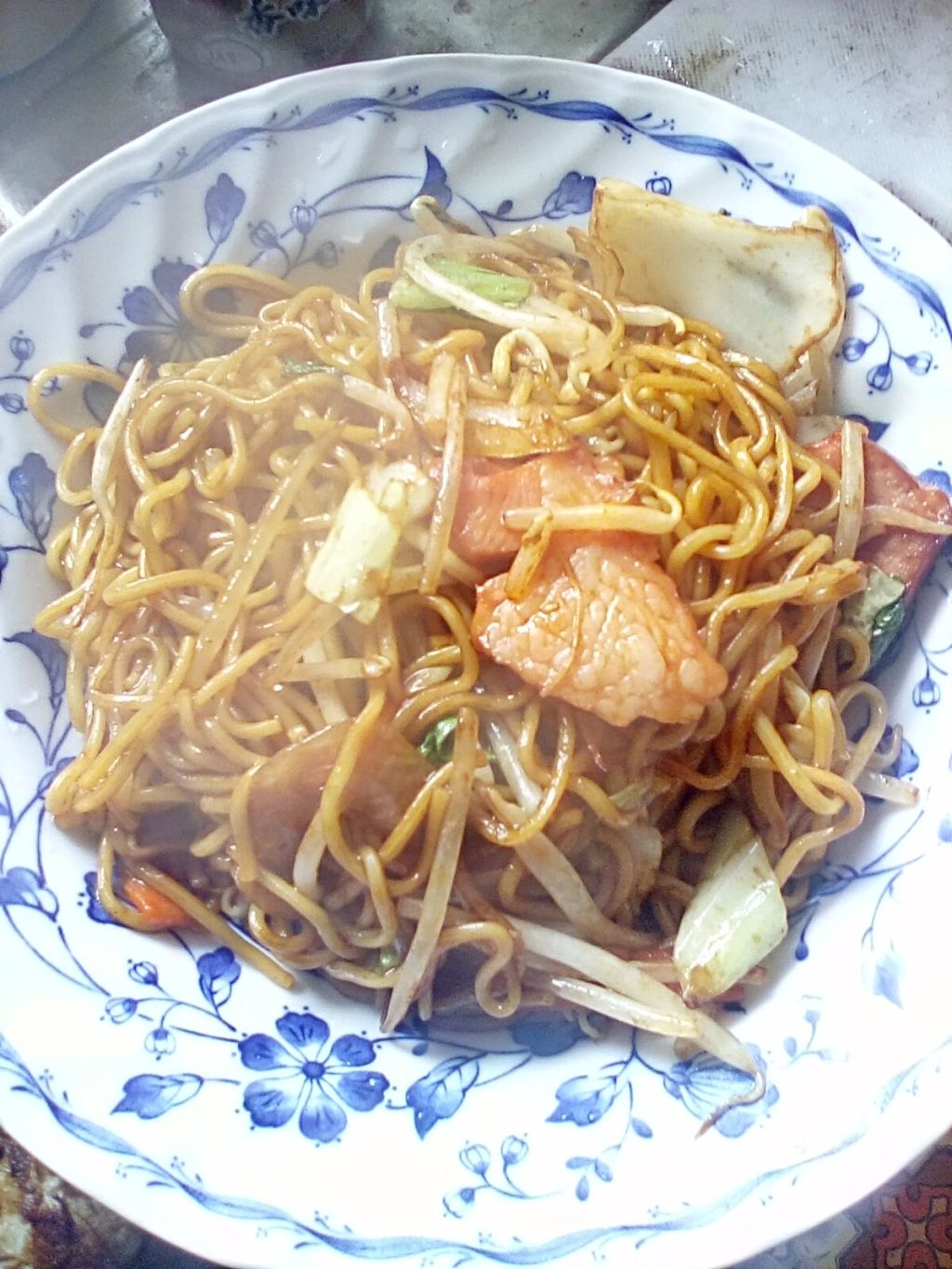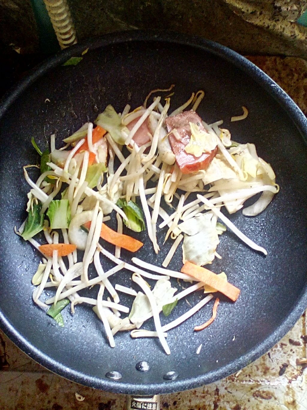 野菜を一旦皿にあげて麺は最初ほぐさないでわざと焦がしてからほぐしてから水をいれる