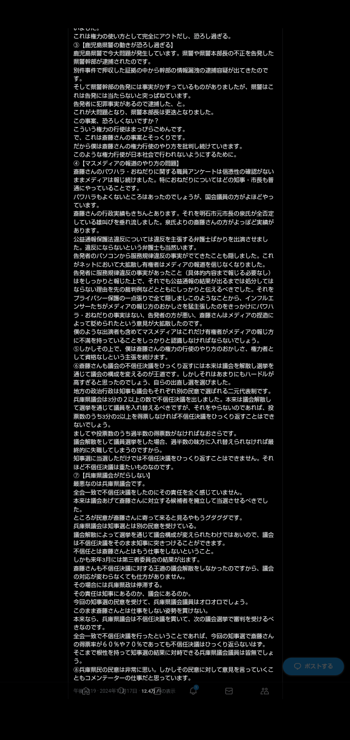 ・鹿児島県警が内部告発者を逮捕した事例を引用し、斉藤の権力の使い方は危険であると繰り返し主張する。