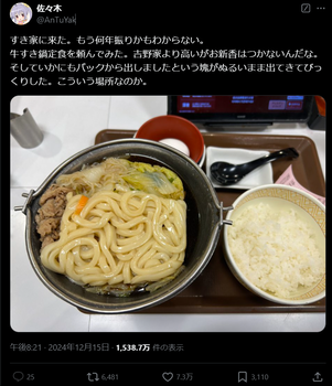 すき家を訪れたという男性がX(旧:Twitter)に写真付きでポスト。その投稿した写真が炎上する事態に陥っている。by 『すき家』袋から出したままの“四角いうどん”提供で炎上、残念なビジュアルに運営会社が答えた - 週刊女性PRIME