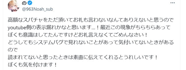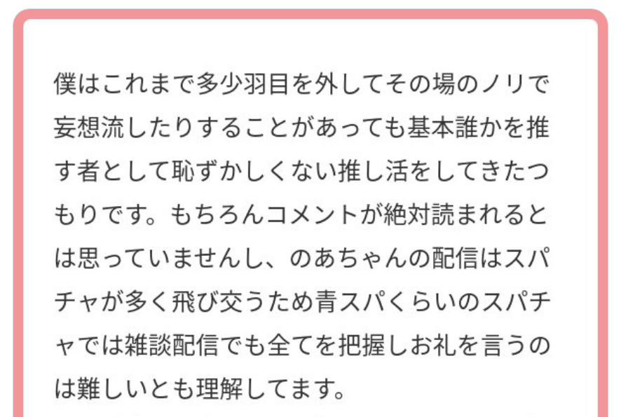 好きな配信者にスパチャすること自体はいいと思う。スパチャが一切なくなれば配信者も活動終了するだろうし。ただ一方的に金払って見返りを求めて文句を言ったりアンチになるやつは意味がわからん。スパチャ貰ってお礼言わなければいけない決まりなんて無い
