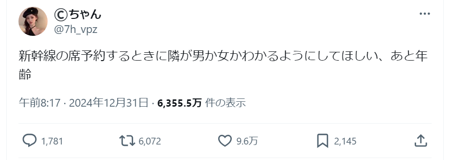 日本人女性「新幹線予約する時に隣が男か女かわかるようにしてほしい。あと年齢」