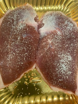 休ませる前と盛り付けた後に胡椒をふってますが、基本塩だけです!脂で塩が落ちるので焼く30分くらい前にしっかり塩を振って味を馴染ませてあります