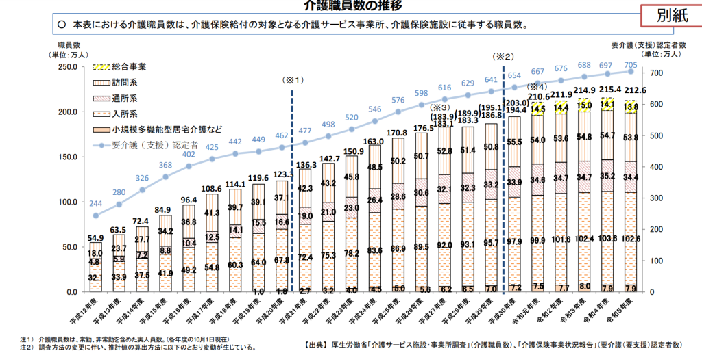 一方で、要介護(支援)認定者数は増加の一途をたどっており、介護職員の減少とのギャップが拡大しています。