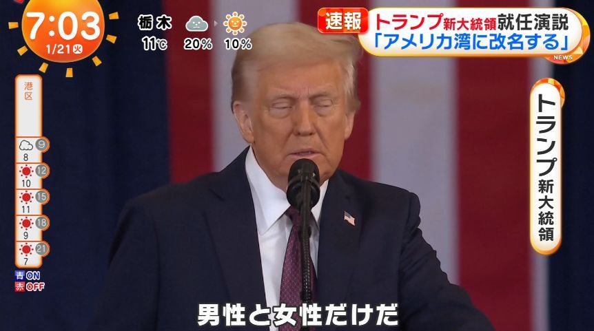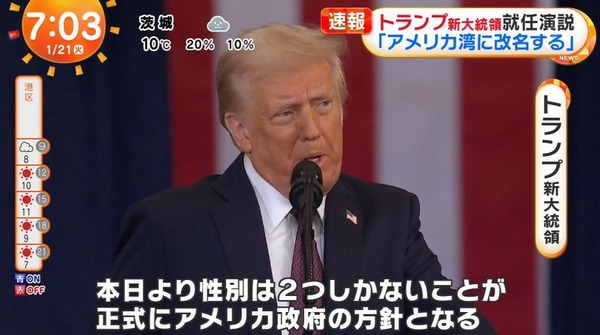 トランプ新米大統領は20日の就任演説で、「本日から連邦政府が認める性別は男性と女by トランプ新大統領「性別は男性と女性だけ」 就任演説で表明、多様性推進「DEI」停止へ性だけだ」と宣言した。LGBTQ(性的少数者)の権利を擁護してきたバイデン前政権とは対照的な姿勢を鮮明にした。