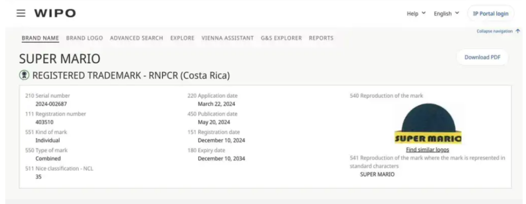 WIPO (世界知的所有権機関) の Web サイトでスーパー マリオの記録を見つけることができます。そこにはスーパーマーケット「SUPER MARIO」のロゴと、そのオーナーであるホセ・マリオ・アルファロ・ゴンサレスの名前が見えます。