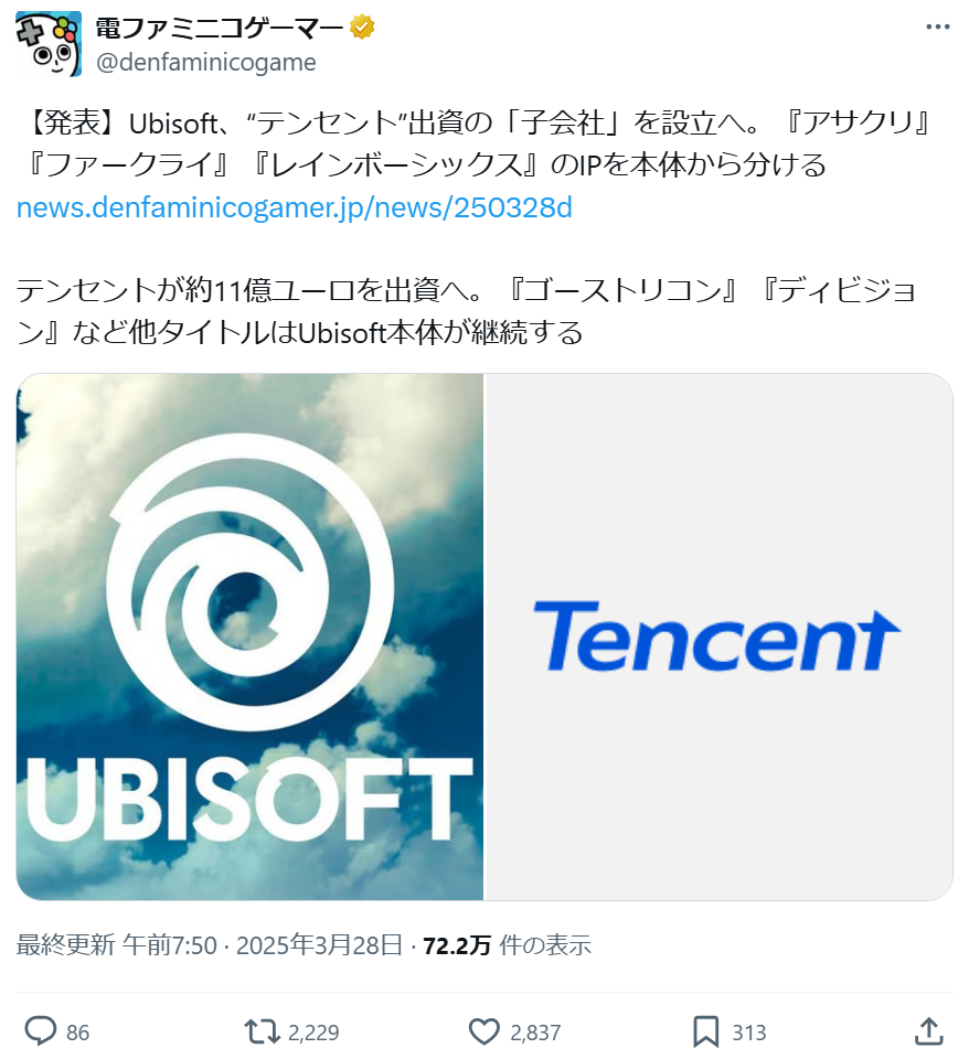 【発表】Ubisoft、“テンセント”出資の「子会社」を設立へ。『アサクリ』『ファークライ』『レインボーシックス』のIPを本体から分けるby denfaminicogame - X