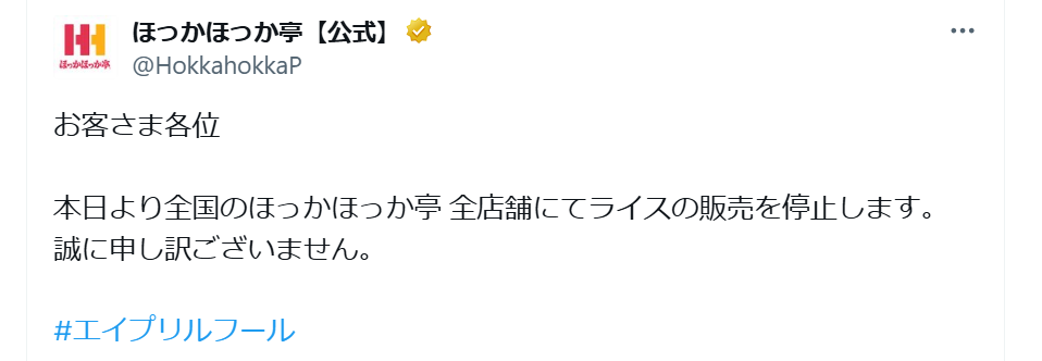 ほっかほっか亭、エイプリルフールに乗っかろうとするもクッソ滑るwww