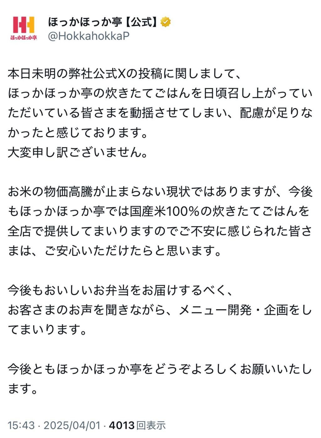 ほっかほっか亭さん、センシティブな話題をネタにして盛大に滑り無事謝罪