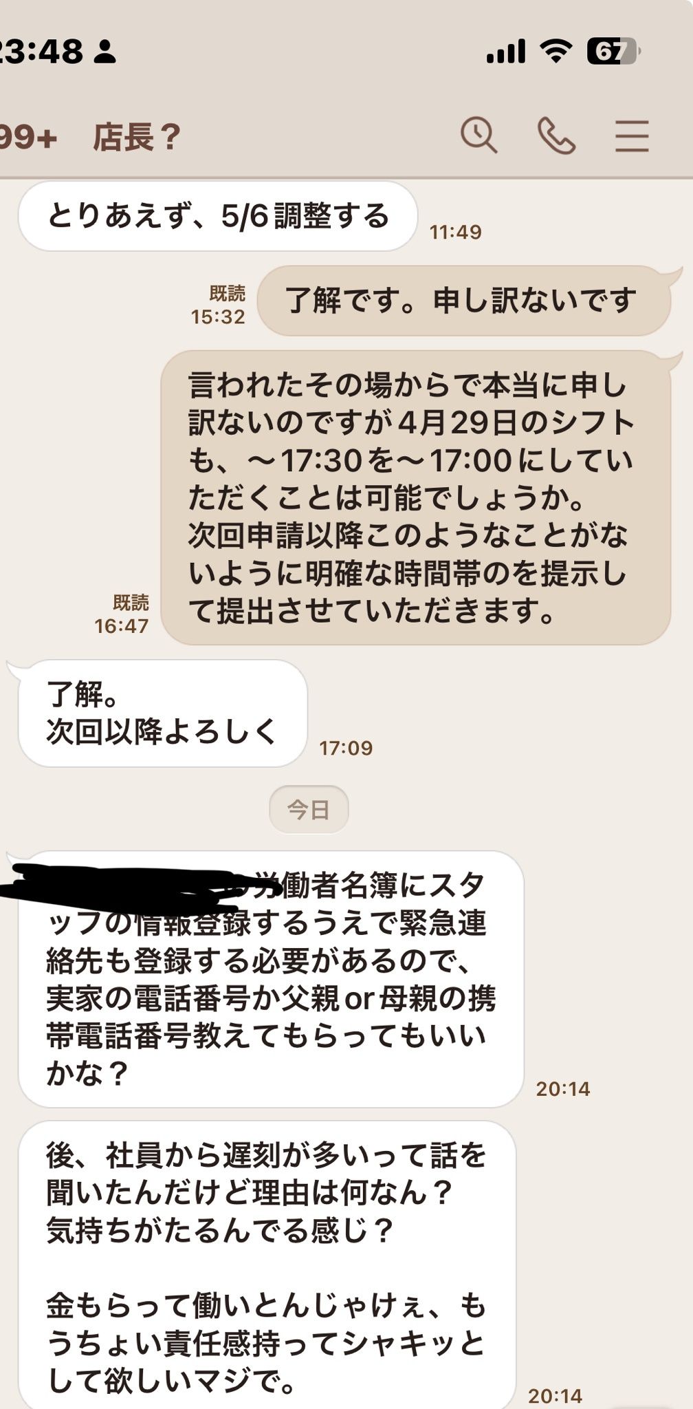 シフトを最初に伝えた時間帯から外れて授業に被るような入れ方されて、ここ行けませんっていくつか指摘したら最初に言え言われて店舗代表者みたいな人不機嫌になるし、遅刻も原因説明してんのにLINEで怒られるし