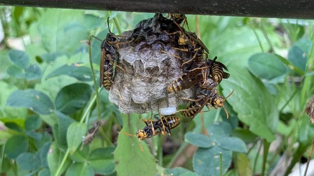有能ワイベランダでせっせと巣を作る女王バチさんを良い頃合いまで作らせて巣を落とすことで根絶やしにする