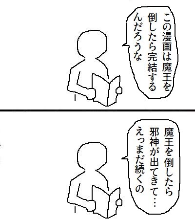 魔王倒したら邪神が出るとかより魔王倒すために四天王倒したらさらに別の幹部が出てきたり人間同士でいざこざ初めるパターンとかのが嫌だな。