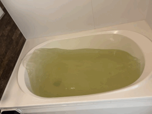 そういうデザインの浴槽と構図のせいなんやろうけど水面がむちゃくちゃ傾いてるように見えるな
