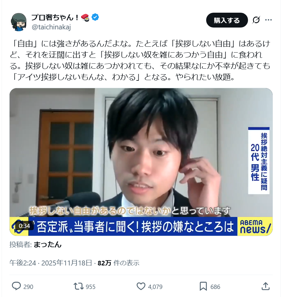 挨拶「できない」のを「しない自由があってもいいと思うんですよね」って言ってるだけだろこいつ・・・見た目でわかるよ