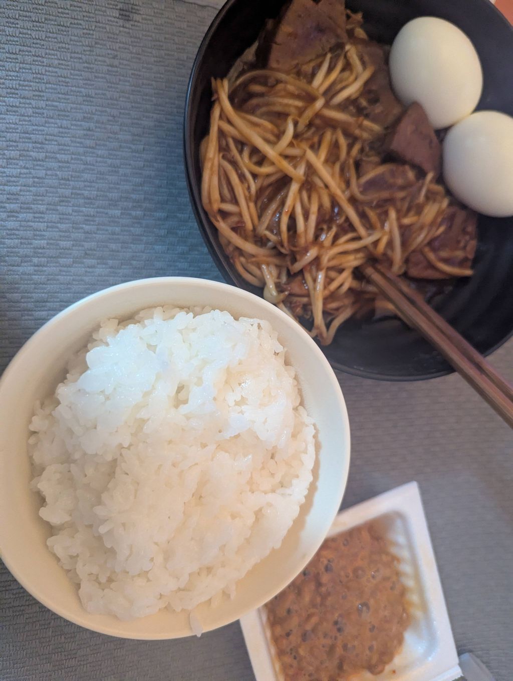 パスタに白米に納豆とゆで卵か