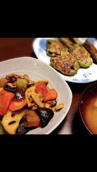 ピーマンの肉詰めに煮物、味噌汁がついて相当頑張ってるように見えるが