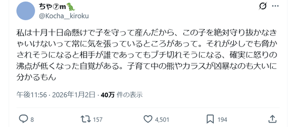 私は十月十日命懸けで子を守って産んだから、この子を絶対守り抜かなきゃいけないって常に気を張っているところがあって。それが少しでも脅かされそうになると相手が誰であってもブチ切れそうになる、確実に怒りの沸点が低くなった自覚がある。子育て中の熊やカラスが凶暴なのも大いに分かるもん