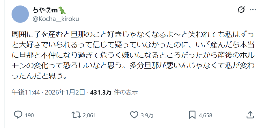 周囲に子を産むと旦那のこと好きじゃなくなるよ~と笑われても私はずっと大好きでいられるって信じて疑っていなかったのに、いざ産んだら本当に旦那と不仲になり過ぎて危うく嫌いになるところだったから産後のホルモンの変化って恐ろしいなと思う。多分旦那が悪いんじゃなくて私が変わったんだと思う。